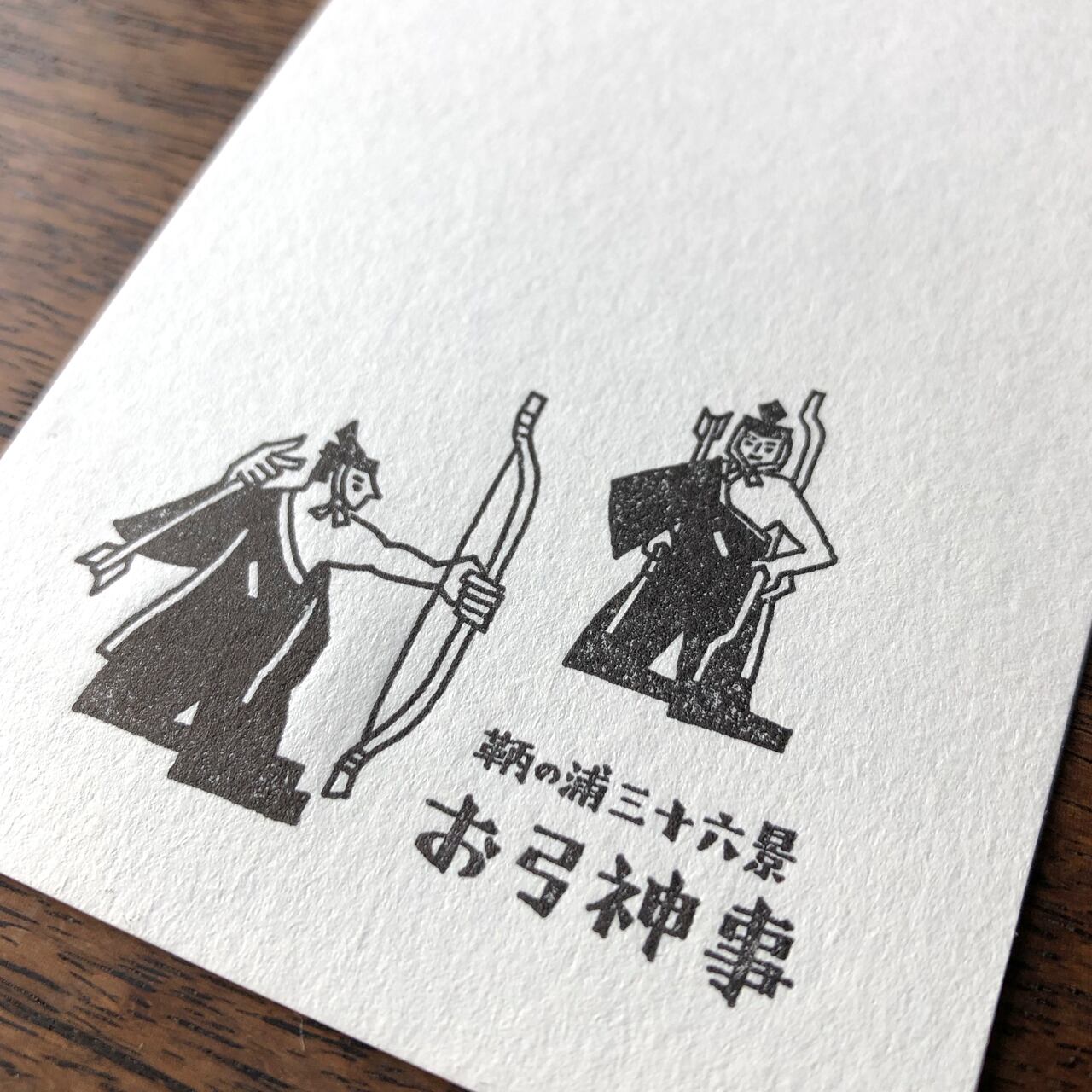 鞆の浦のお祭りや風景を「鞆の浦三十六景」をテーマに描き、手刷りの活版印刷でつくる一筆箋。こちらは「お弓神事」です。