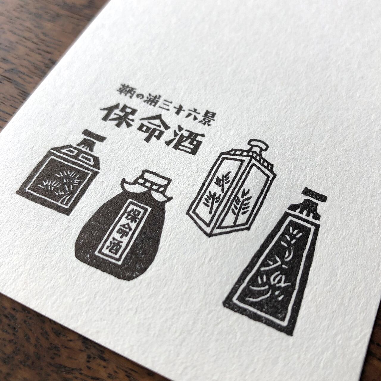 鞆の浦のお祭りや風景を「鞆の浦三十六景」をテーマに描き、手刷りの活版印刷でつくる一筆箋。こちらは「保命酒」です。